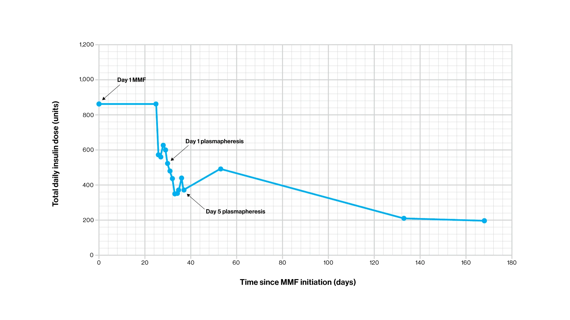 Graph showing the decrease in total daily insulin dose over time after mycophenolate mofetil (MMF) initiation. Further reduction in insulin requirement is demonstrated after plasmapheresis occurring on days 29 through 37.