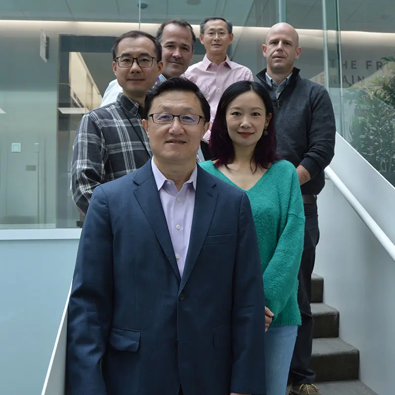 Zhenyu Yue, PhD, front center, with, clockwise, Zhuhao Wu, PhD; John F. Crary, MD, PhD; Bin Zhang, PhD; Joel Blanchard, PhD; and Nan Yang, PhD
